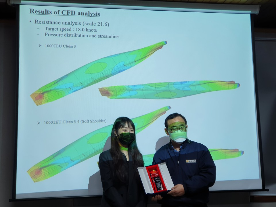 I'd like to congratulate that Ms. Min Kyung LEE, one of Ph. D. candidates in our lab. (Ship Resistance Performance Lab, Pusan National University) was awarded a plaque of appreciation by Mr. Soo Geun LEE, the president of Dae Sun Shipbuilding and Engineering Co. Ltd. on December 16, 2021. This was in recognition of her exceptional contribution to the development of energy-efficient hull form for INNOVA2030 1,000 TEU container carrier through CFD (Computational Fluid Dynamics) analysis of resistance performance. It is our privilege to have an opportunity to join the design process of the 1,000 TEU container carrier for Dae Sun Shipbuilding. Owing to the advanced hull form design and CFD analysis, the new container carrier has achieved 18% reduction of DFOC (Daily Fuel Oil Consumption) and 40% improvement of EEDI (Energy Efficiency Design Index) over conventional container carrier. On December 8, two vessels were delivered to the ship owner, Namsung Shipping Co. Ltd. Special appreciation is extended to Mr. Seung Myun HWANGBO, the adjunct professor in our lab. Without his inspiration and devotion, this huge achievement would have been impossible. Most of all, I am very pleased that this industry-university liaison became a great opportunity for Min Kyung to advance her expertise as a good design engineer. I am rooting for her ceaseless challenge. Congratulations again ! #hullformdesign